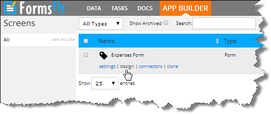 If you need to get back here to modify an existing Form, you can use App Builder > Screens again and the roll over the form you want, then click Design.